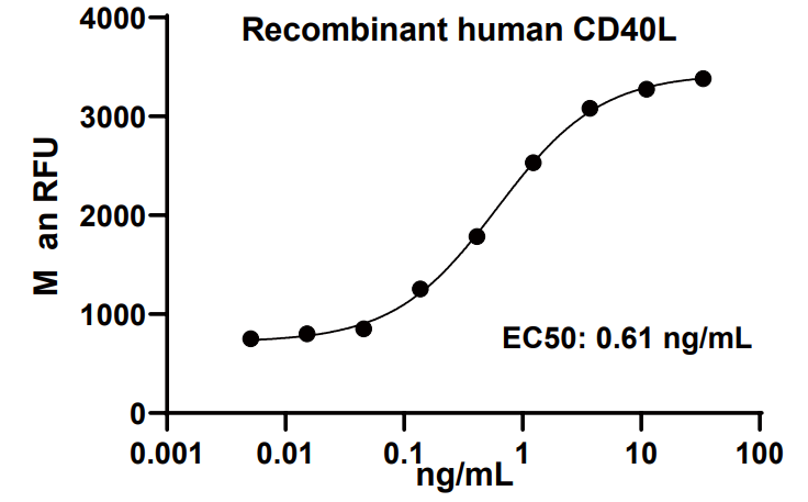 CD40 配体,也称为 TNFSF、CD154、TRAP 和 gp39,是一种 34-39 kDa II 型跨膜糖蛋白,属于 TNF 超家族 。成熟的人 CD40 配体由 22 个氨基酸 (aa) 胞质结构域、跨膜片段和 215 个 aa 胞外区组成。人类 CD40 配体的胞外结构域与小鼠和大鼠 CD40 配体的 aa 序列同一性分别为 74% 和 76%。与其他 TNF 超家族成员类似,CD40 配体形成具有生物活性的同型三聚体,既有膜结合形式,也有可溶形式 (6-9)。CD40 配体在血小板上表达,也在活化的 T 细胞和 B 细胞、嗜碱性粒细胞、嗜酸性粒细胞、成纤维细胞、肥大细胞、单核细胞、自然杀伤细胞、血管内皮细胞和平滑肌细胞上表达。本品以液体形式提供,高活性、高纯度、低内毒素、无标签。