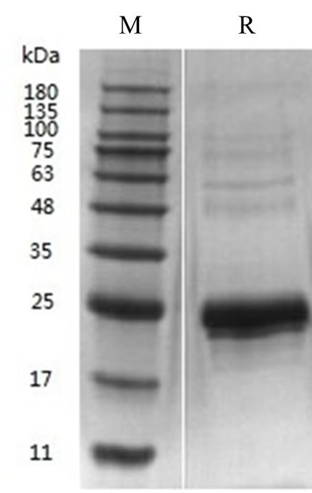 Human VEGF165 Protein on SDS-PAGE under reducing (R) condition. The purity is greater than 95%.