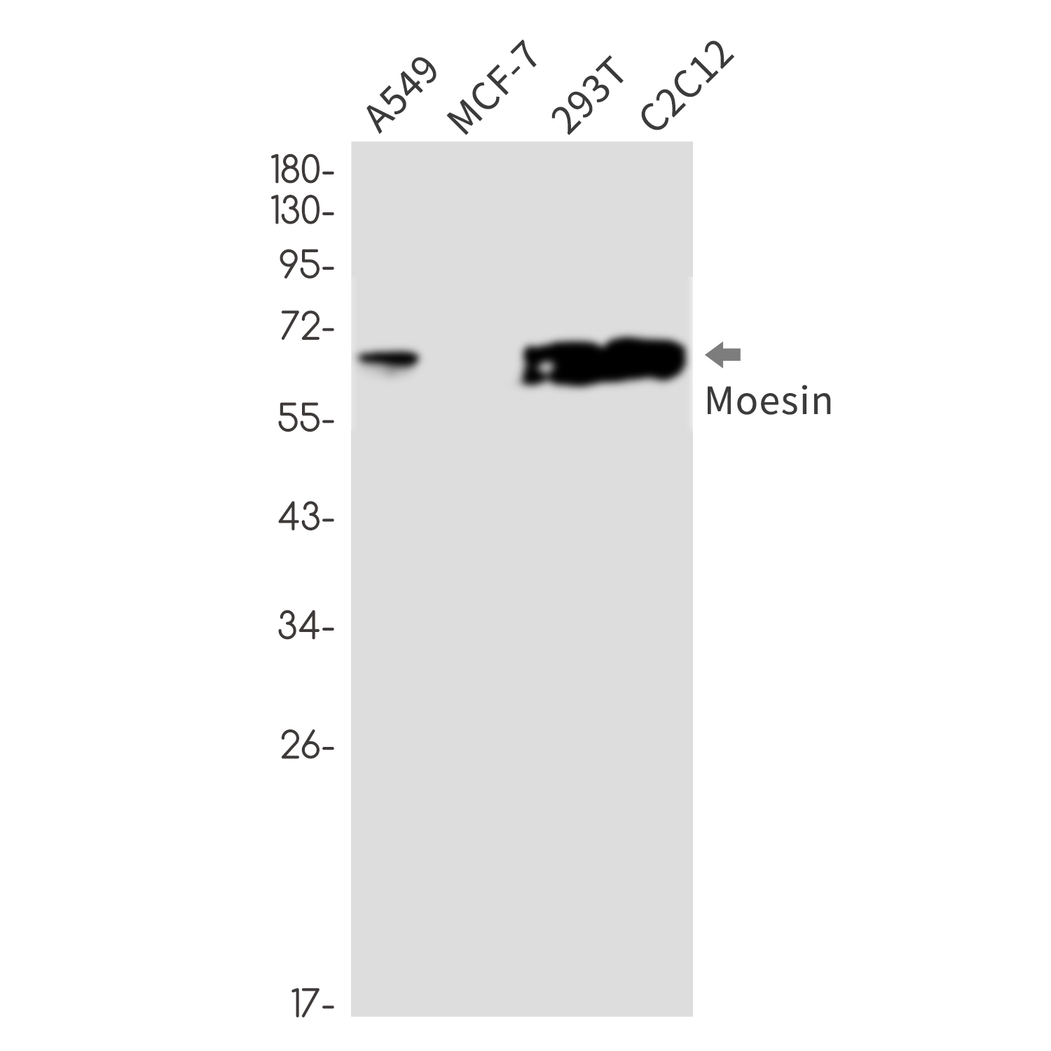 Western blot analysis of Moesin in A549, MCF-7, 293T, C2C12 lysates using Moesin antibody
