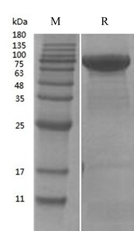 Bovine Transferrin (HOLO) Protein on SDS-PAGE under reducing (R) condition. The purity is greater than 95%.