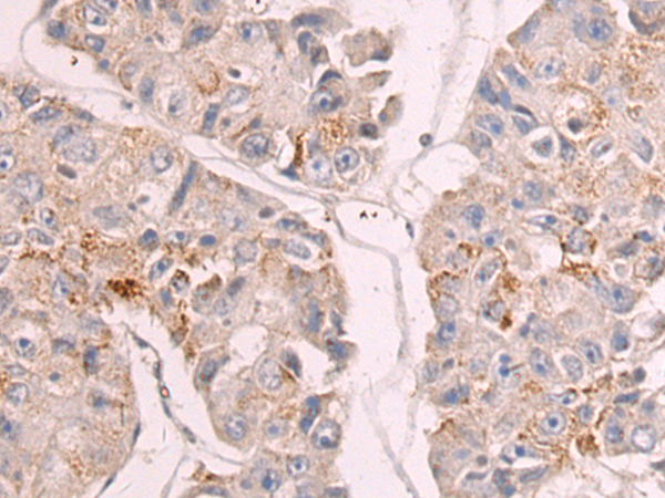 Immunohistochemistry analysis of paraffin-embedded Human liver cancer using GDF9 antibody. High-pressure and temperature Sodium Citrate pH 6.0 was used for antigen retrieval.